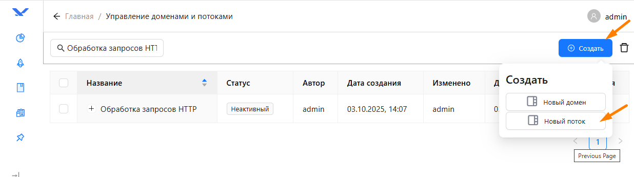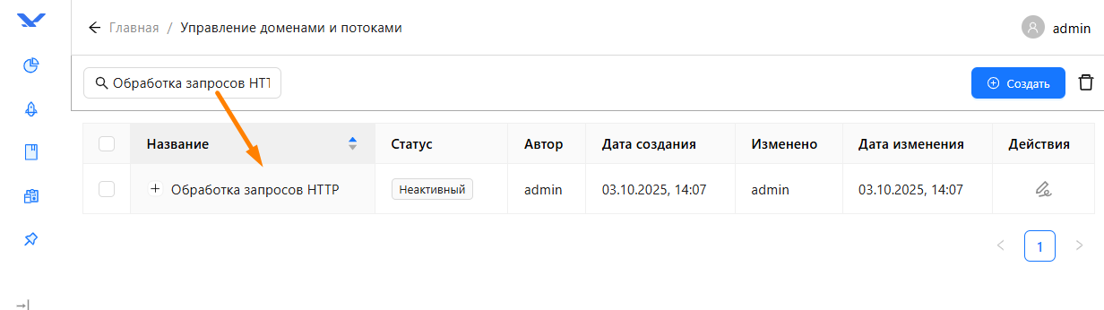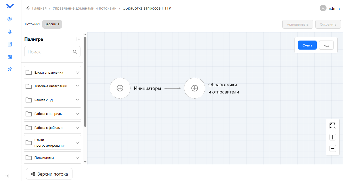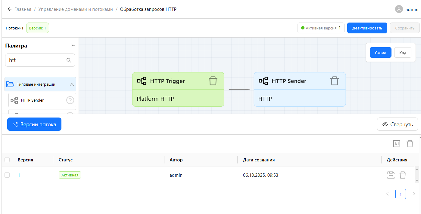 Открывается окно редактора потоков с версией 1 в статусе "Черновик".