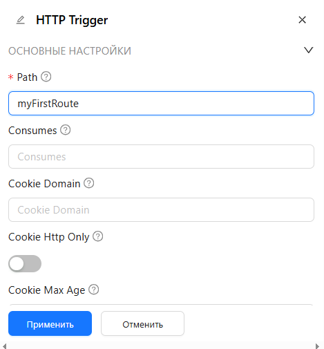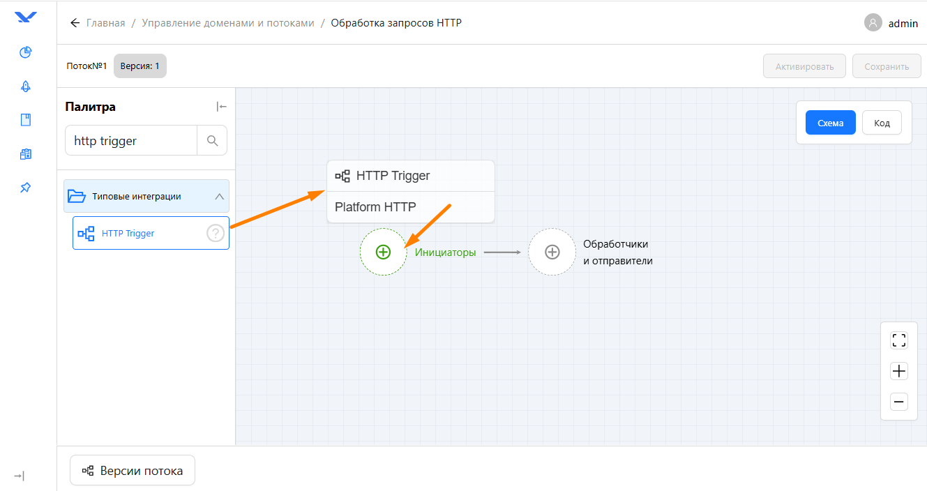 Перетащите блок HTTP Trigger на рабочую область на место пустого блока «Инициаторы».