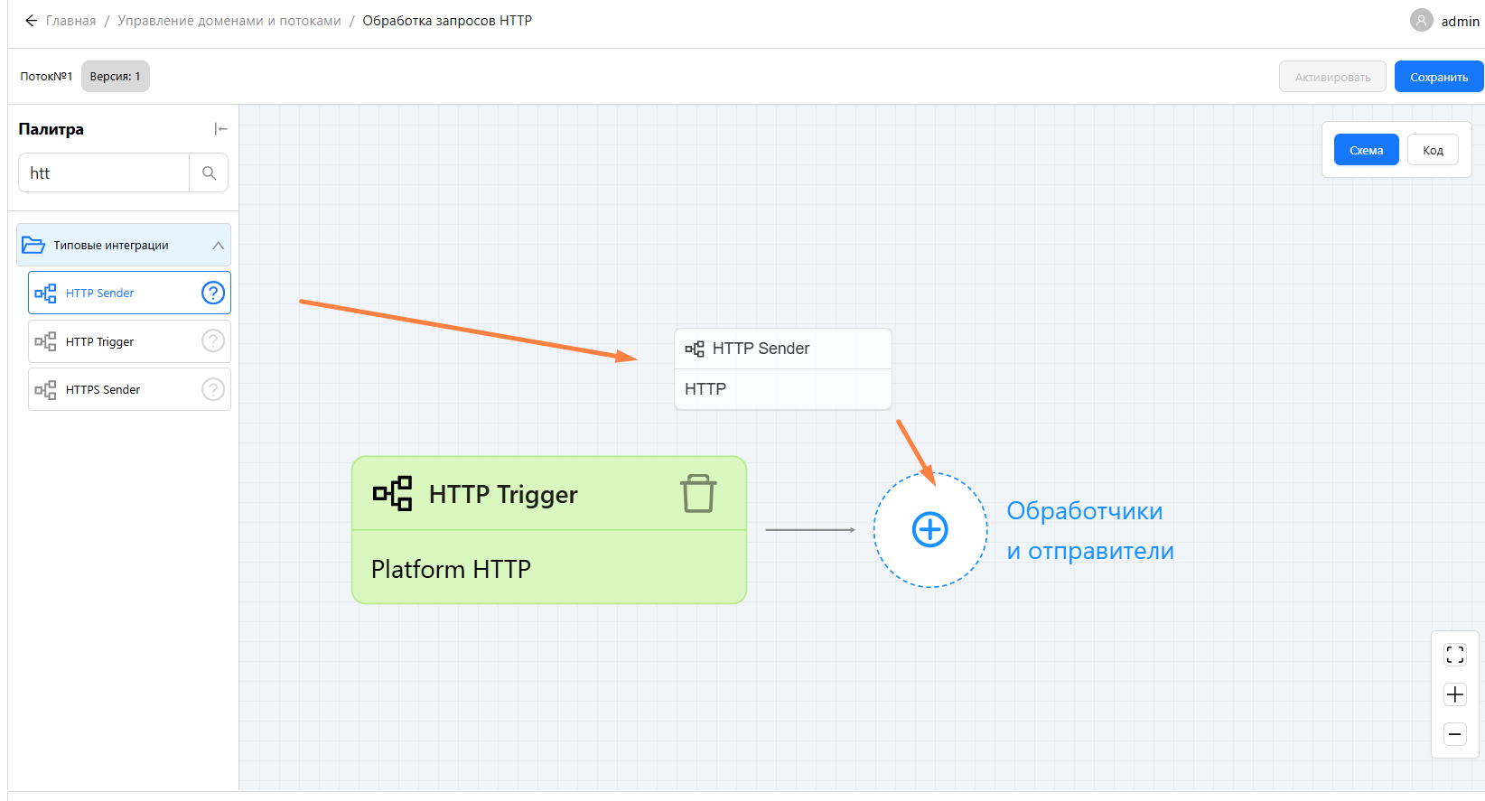 Перетащите блок HTTP Sender на рабочую область на место пустого блока «Обработчики и отправители».