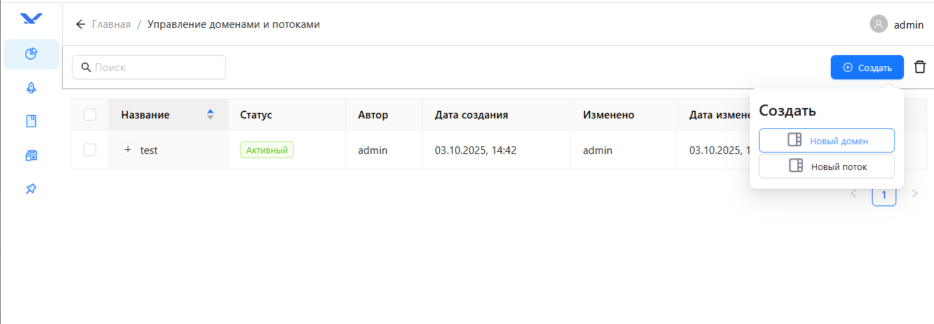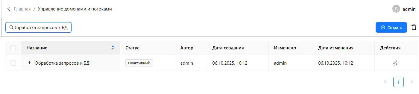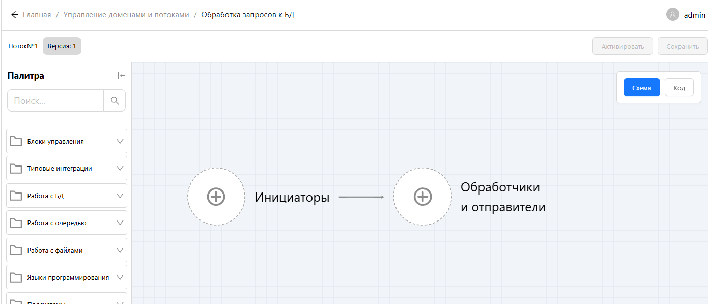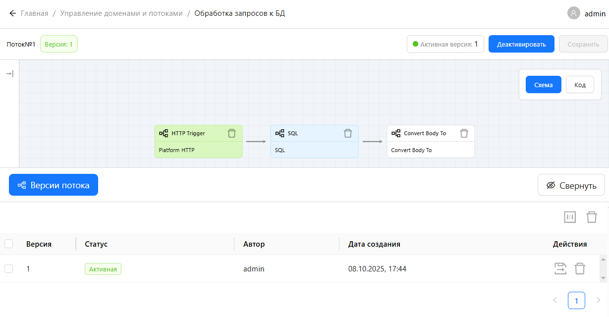 Открывается окно редактора потоков с версией 1 в статусе "Черновик".