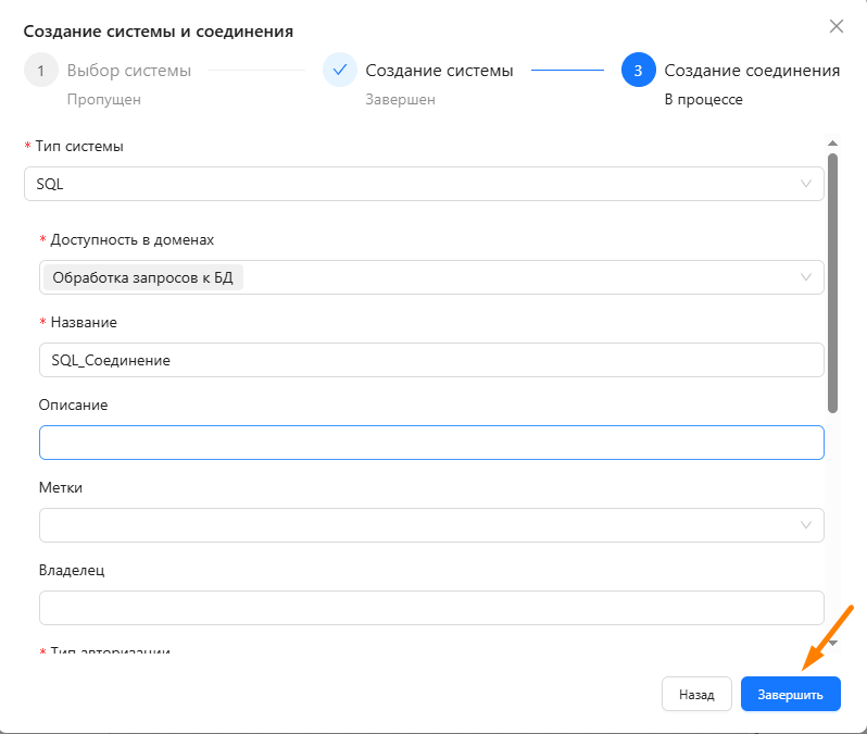 Перетащите блок SQL на рабочую область на место пустого блока «Обработчики и отправители».