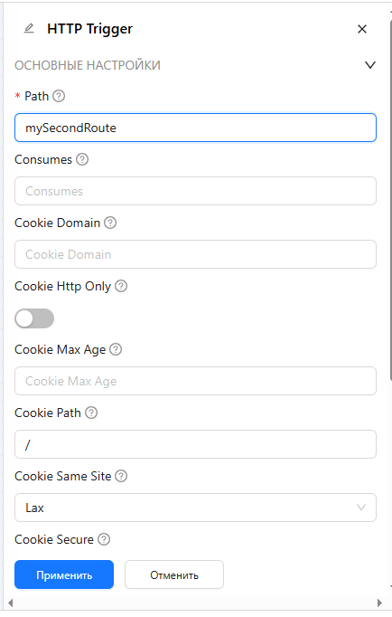 Щелкните на блоке HTTP Trigger и в открывшейся панели заполните параметр: