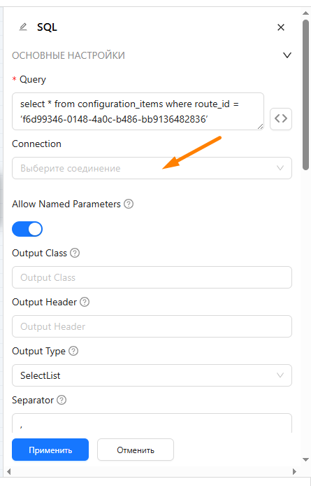 Query – SQL запрос (пример, select * from configuration_items where route_id = ‘id текущего потока’)