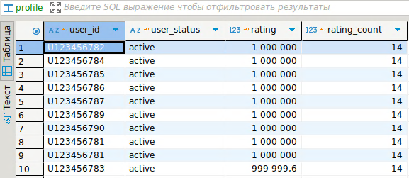 CREATE TABLE public.profile ( user_id varchar NULL, user_status varchar NULL,rating numeric NULL,rating_count numeric NULL);