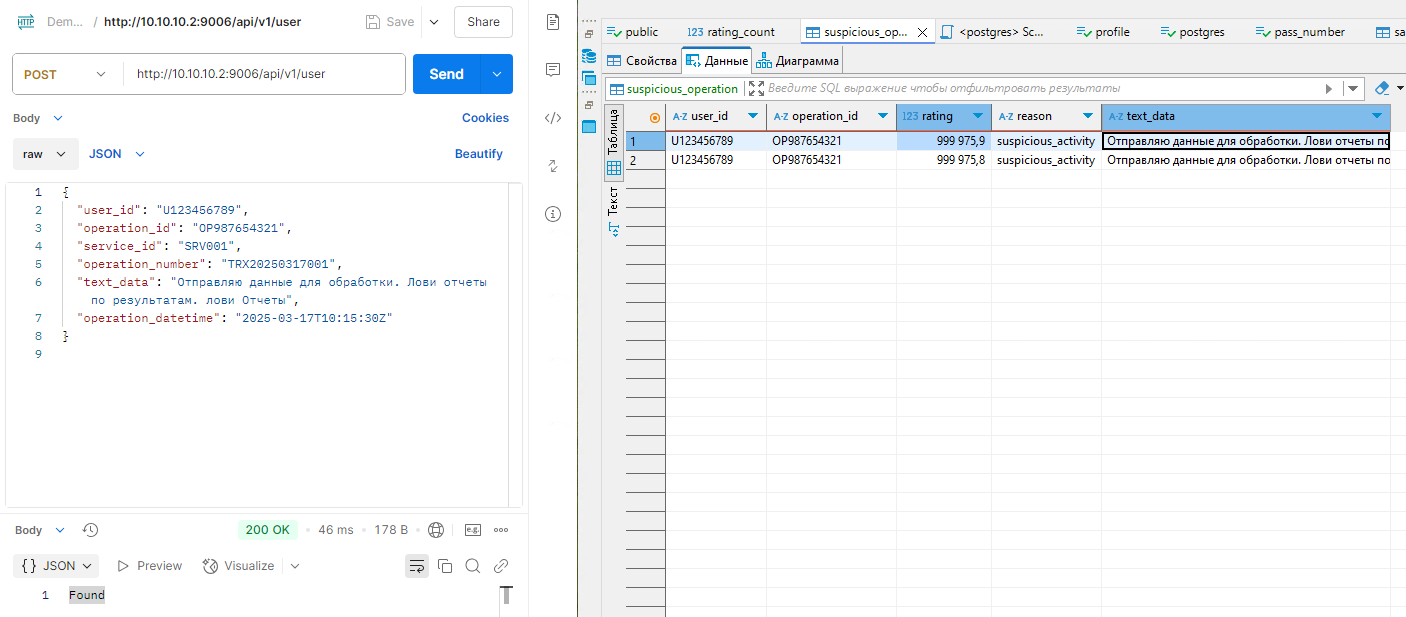 В случае обнаружения подозрительного контента в результате обработки запроса будет создаваться запись в таблице в базе данных, в которую будут сохраняться идентификатор клиента, идентификатор операции, обновленный рейтинг, причина обновления рейтинга, текст запроса.