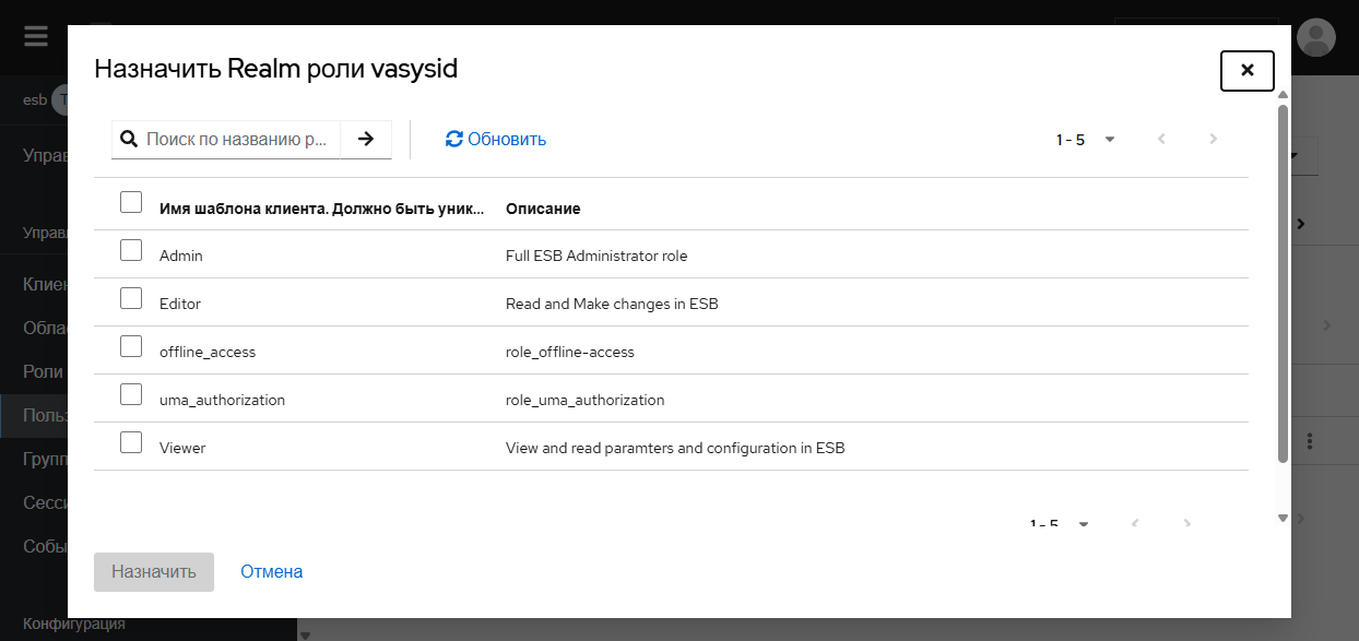 - Назначить пользователю роли. Подробная информация приведена в разделе Роли ESB в Keycloak.