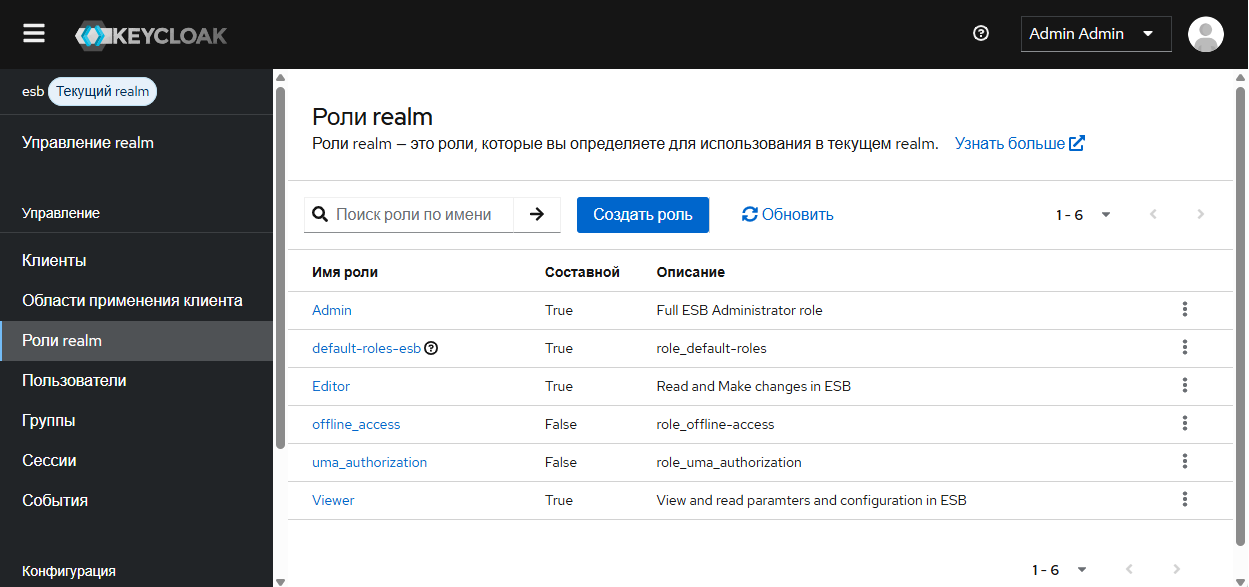 - default-roles-esb - роль служит контейнером для ролей по умолчанию как realm, так и клиента. Эту роль нельзя удалить.