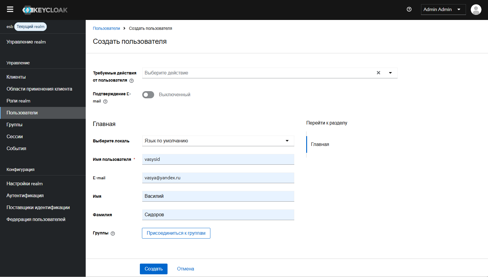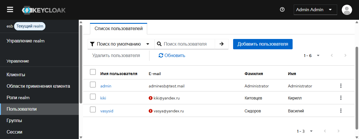 Пользователи ESB регистрируются администратором в Keycloak на странице Пользователи.