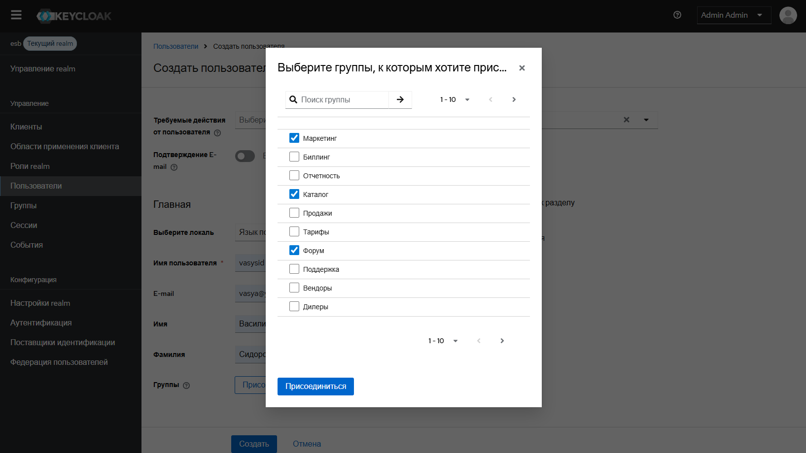 Вы можете присоединить пользователя к группам с помощью кнопки Присоединиться к группам. Группы в Keycloak соответствуют доменам в ESB – при создании домена в ESB автоматически создается соответствующая группа в Keycloak. Во всплывающем окне вы можете выбрать нужные домены из тех, к которым пользователь должен иметь доступ.