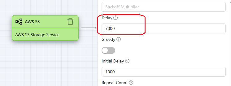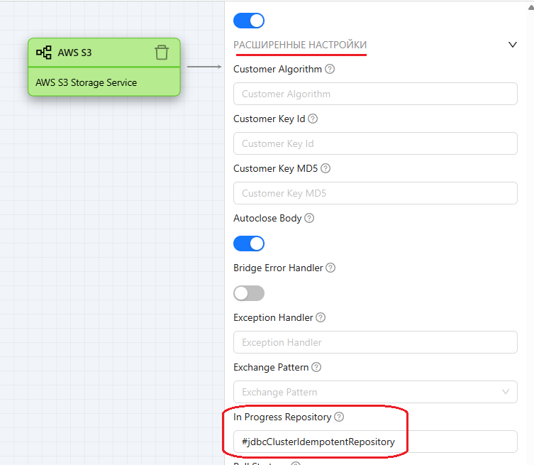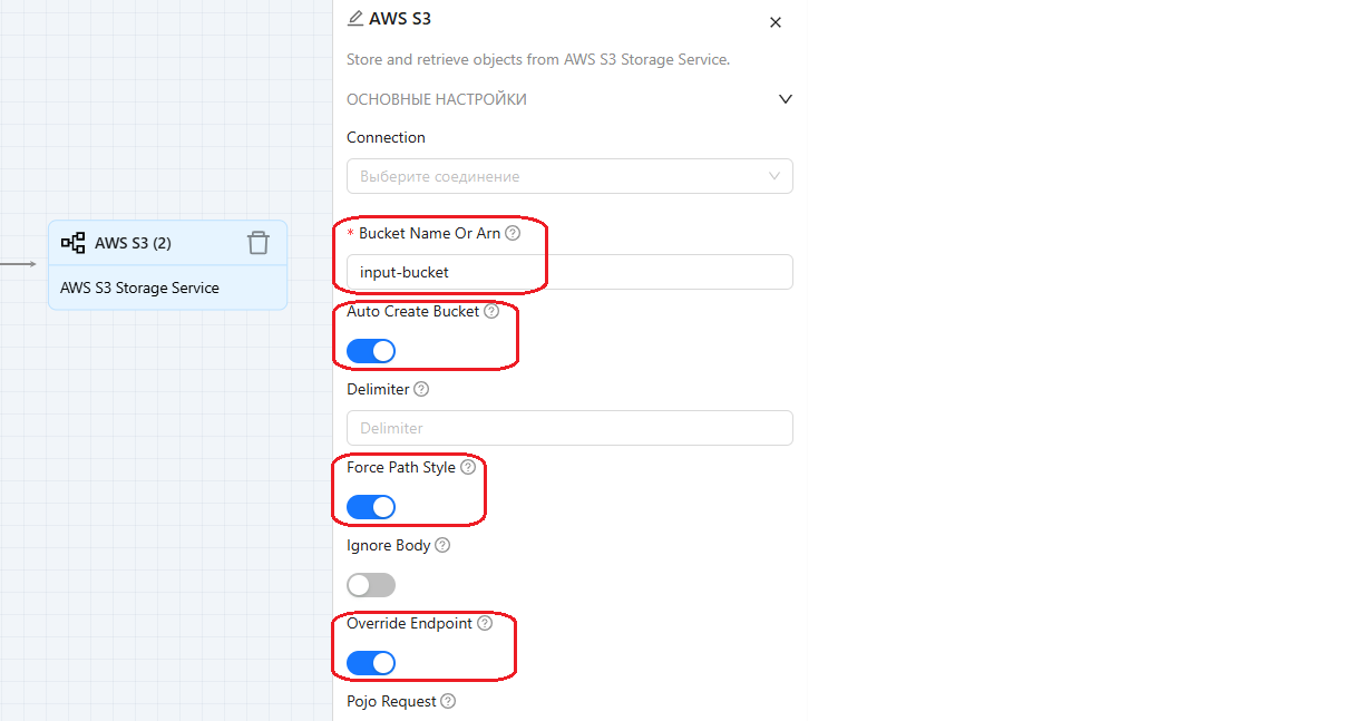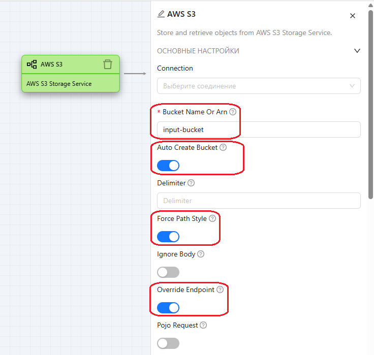- Добавьте в качестве инициирующего блока и сконфигурируйте блок AWS S3, как показано на рисунках ниже.