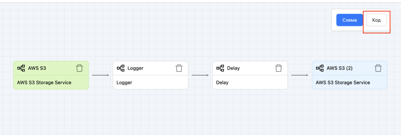 Чтобы проверить код потока, перейдите режим отображения кода, нажав на кнопку Код в правом верхнем углу рабочей области.