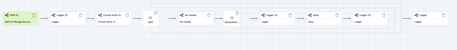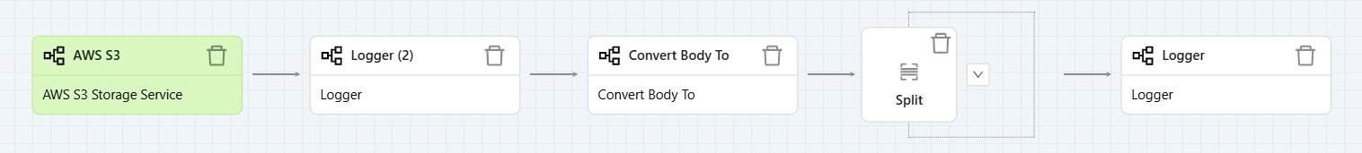 AWS S3 🡪 Logger 🡪 Convert Body To 🡪 Split 🡪 Logger