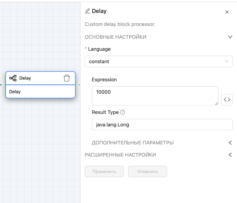 При необходимости добавьте блоки логгирования Logger и блок временной задержки между обработкой файлов Delay. В каждом блоке сконфигурируйте настройки и примените изменения, нажав Применить.