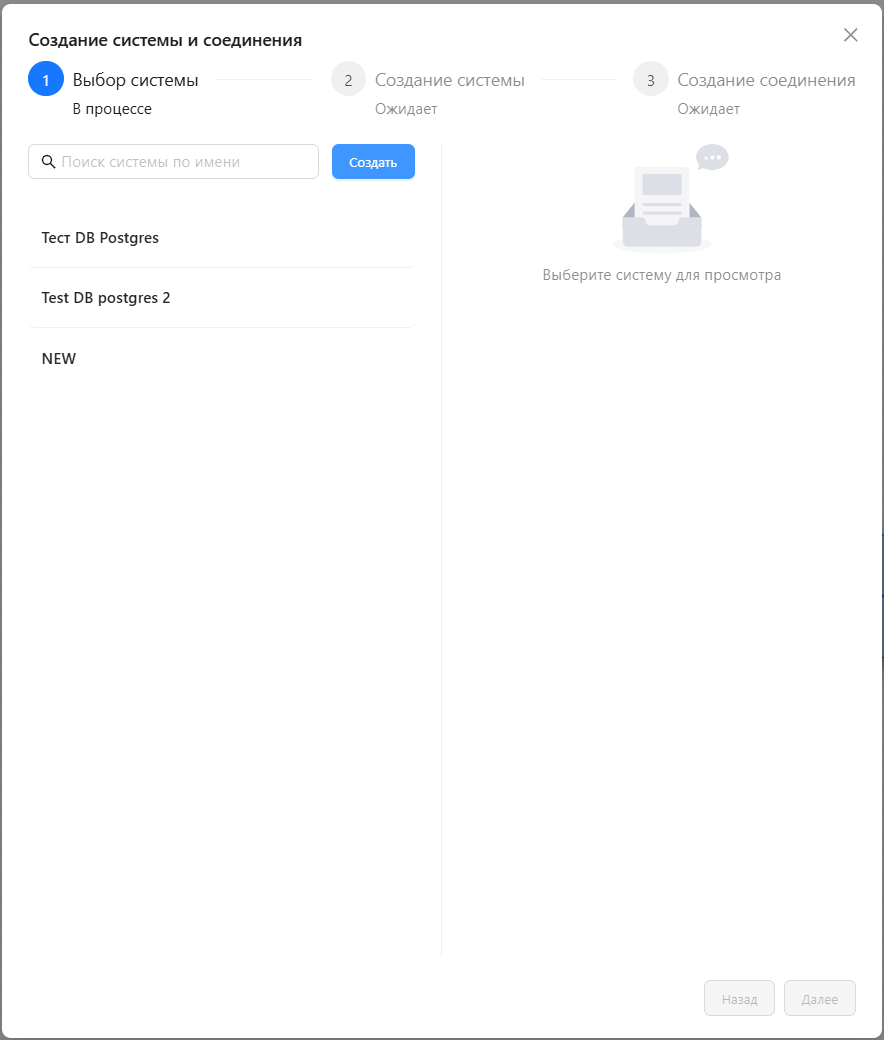 Найдите и выберите уже созданную систему из списка, для которой будет создаваться соединение.