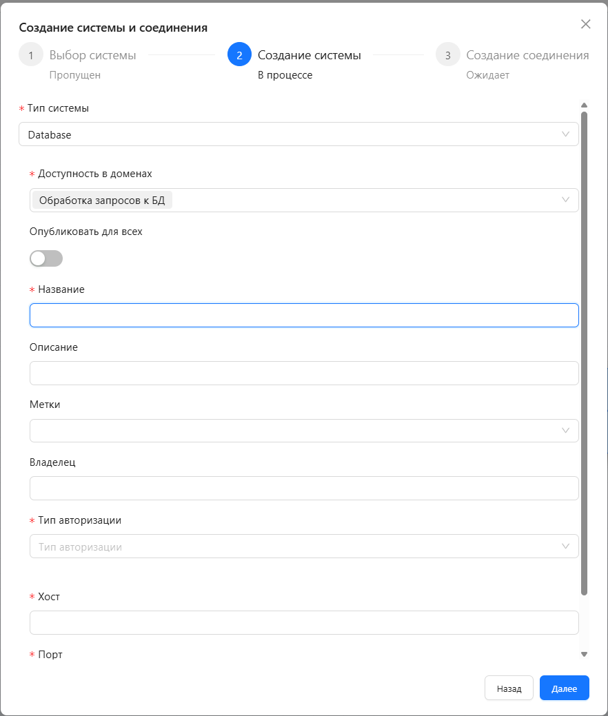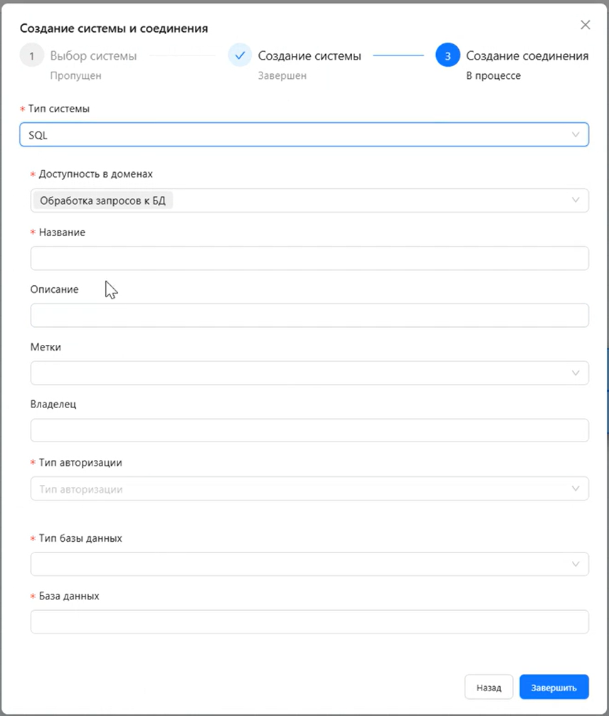 - Форма создания соединения - вызывается после выбора или создания системы. Позволяет создать соединение.