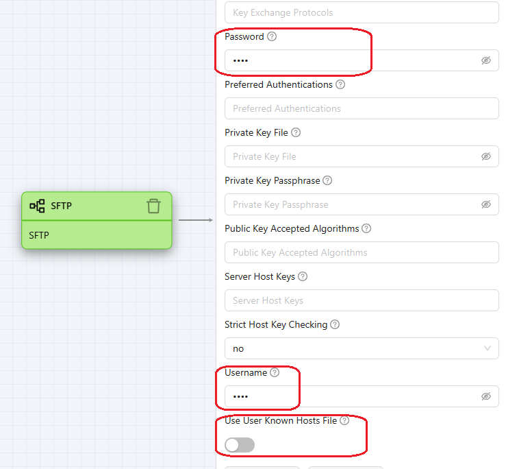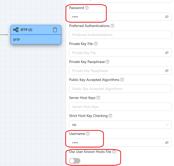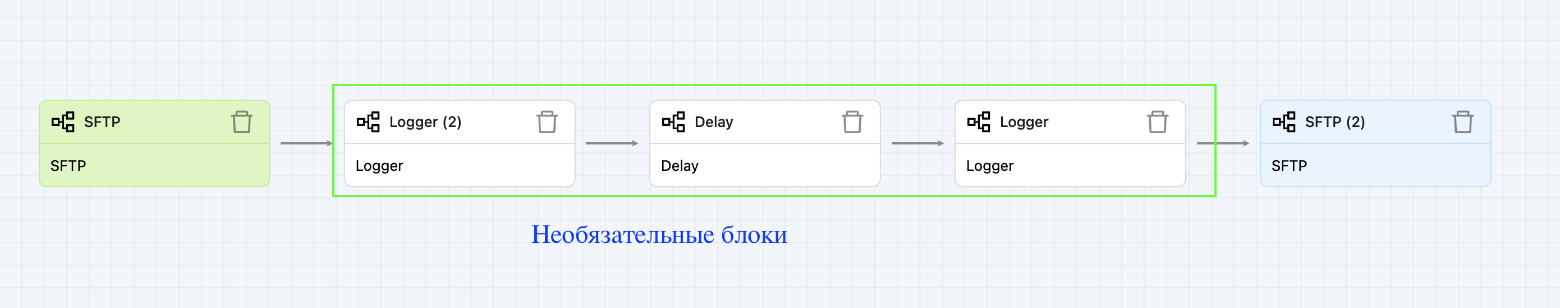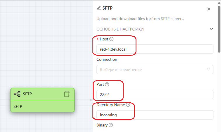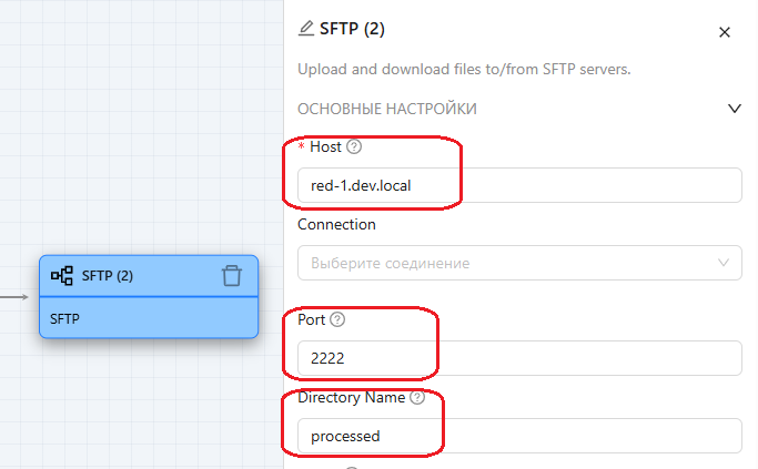 - Добавьте второй блок SFTP и сконфигурируйте его параметры, как показано на рисунках ниже.