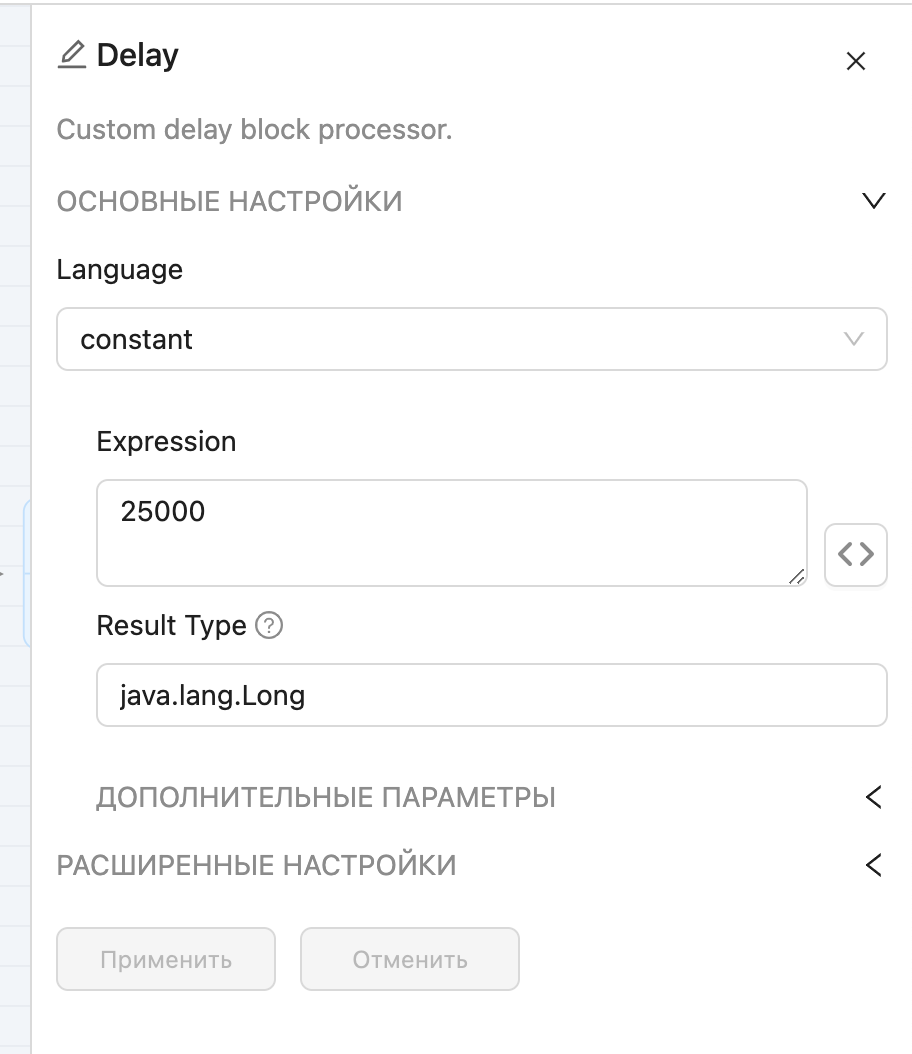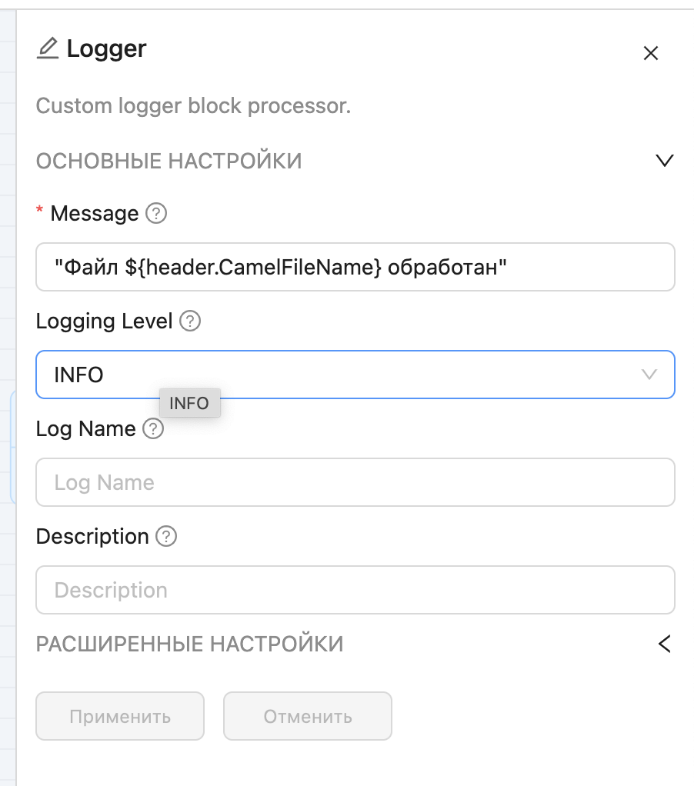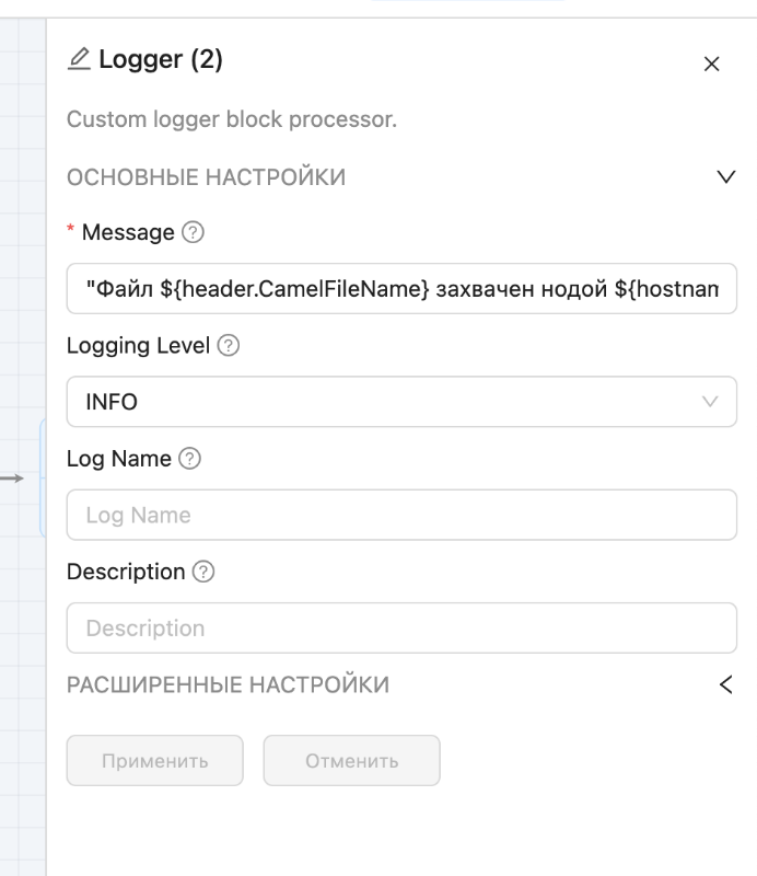 При необходимости добавьте блоки логгирования Logger и блок временной задержки между обработкой файлов Delay. В каждом блоке сконфигурируйте настройки и примените изменения, нажав Применить.