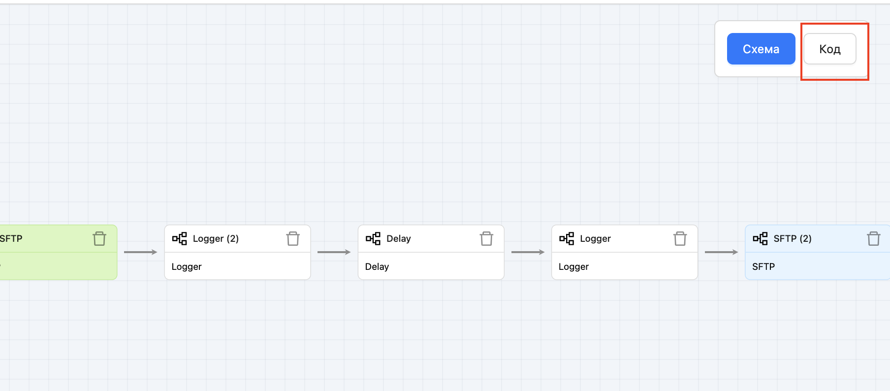 Чтобы проверить код потока, перейдите режим отображения кода, нажав на кнопку Код в правом верхнем углу рабочей области.