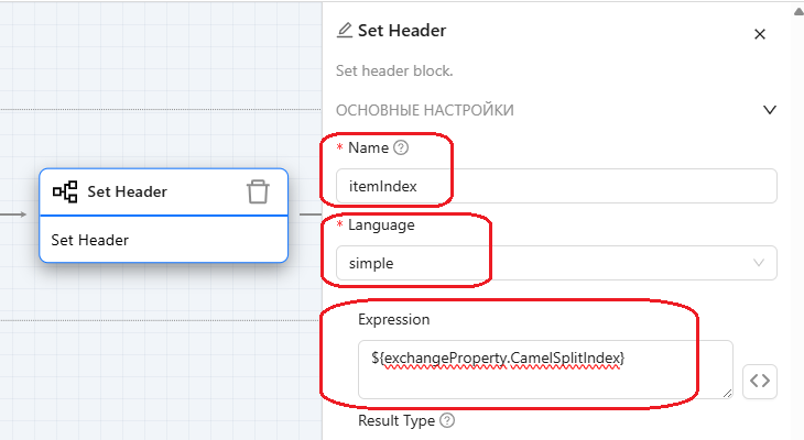 - Добавьте блок Set Header первым в блок Split. Установите следующие параметры: