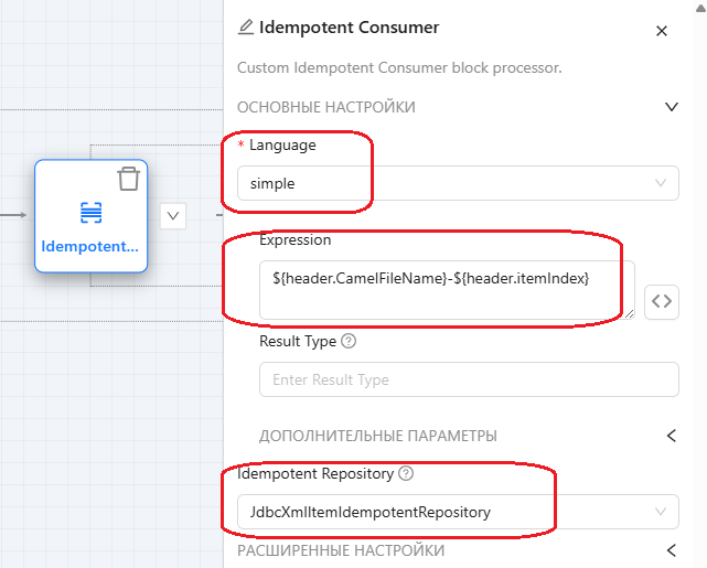 - Добавьте блок Idempotent Consumer после блока Set Header. Установите следующие параметры: