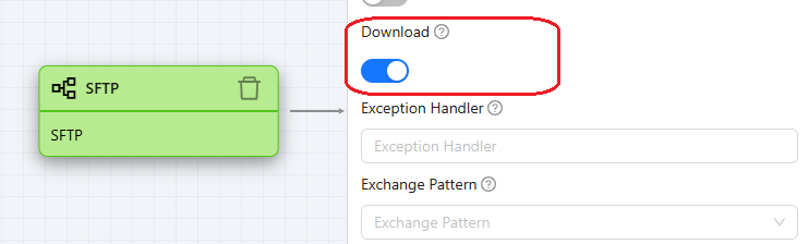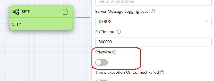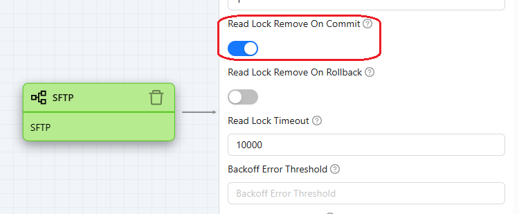 Добавьте на рабочую область блок SFTP в качестве инициирующего блока. Сконфигурируйте его параметры так же, как в первом примере – для обработки целых файлов. Все критические параметры заполняются так же, за исключением параметра Move – его значение заполнять не надо.