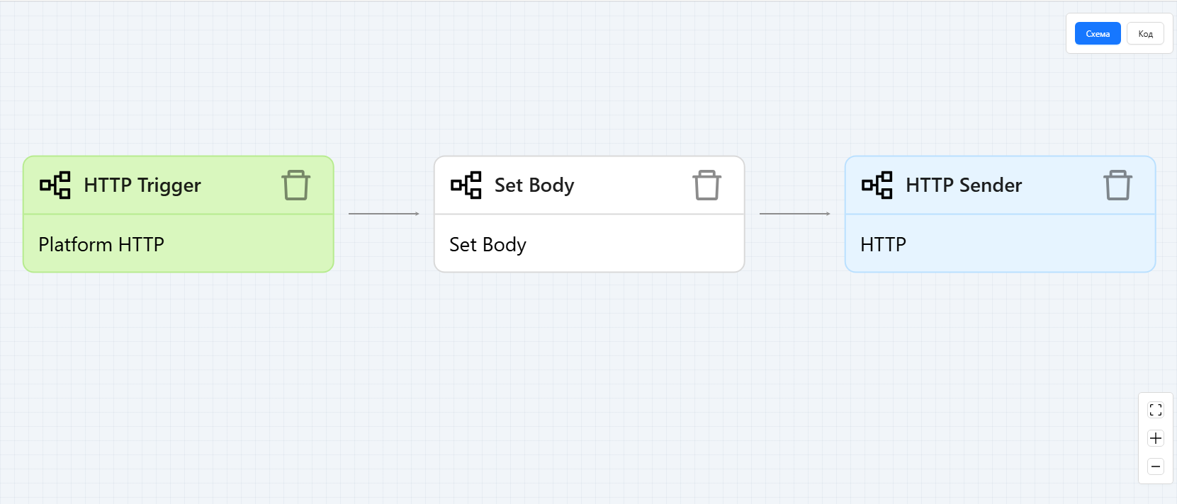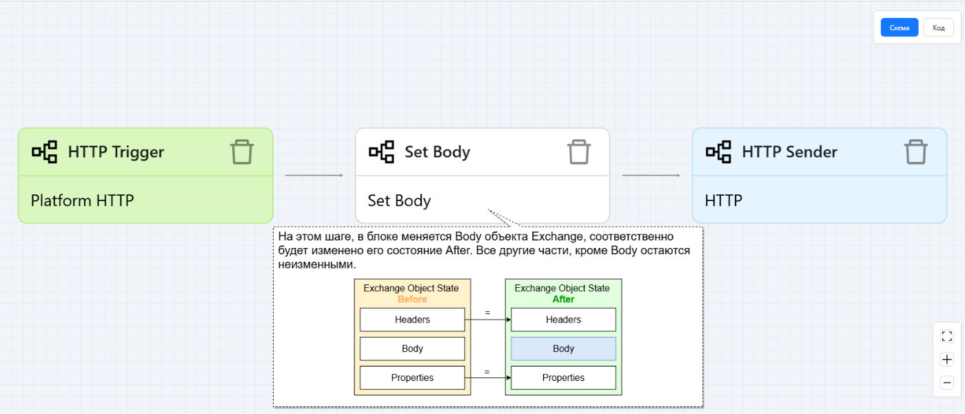 Рассмотрим простой пример создания и передачи объекта Exchange. Создадим простой поток из трех блоков – HTTP Trigger, Set Body и Http Sender.