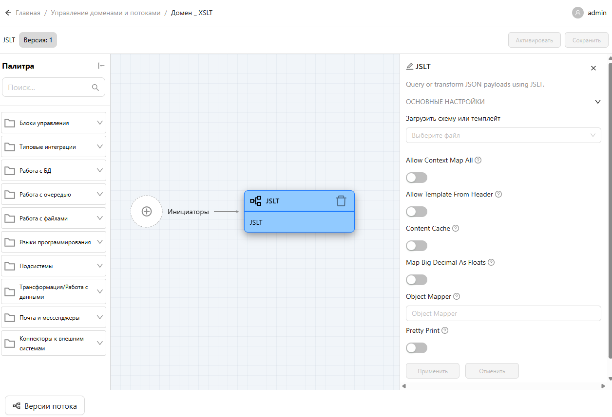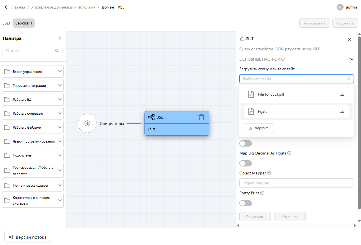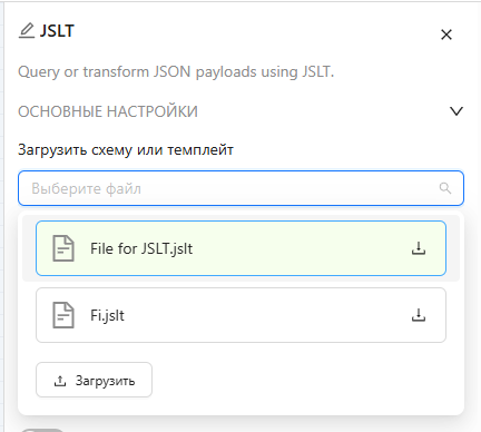| JSLT | Трансформирует JSON в JSON с помощью загруженной JSLT спецификации. | JSLT |