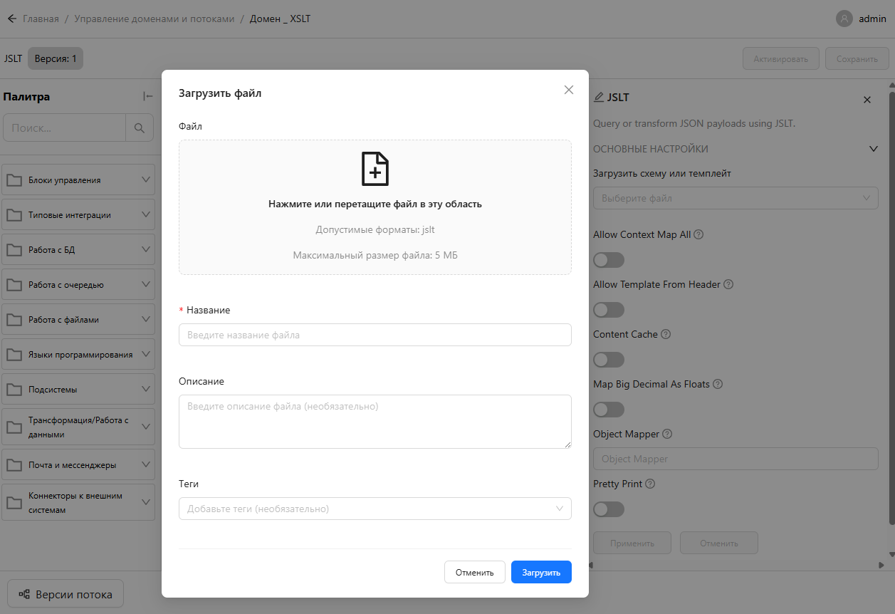 | XSLT | Трансформирует XML сообщения с помощью шаблонов на базе XSLT Saxon. XSLT Saxon – это движок более мощный чем тот, на котором реализован XSLT. Он более медленный в целом, но зато быстрее работает с большими файлами, чем XSLT. | XSLT |