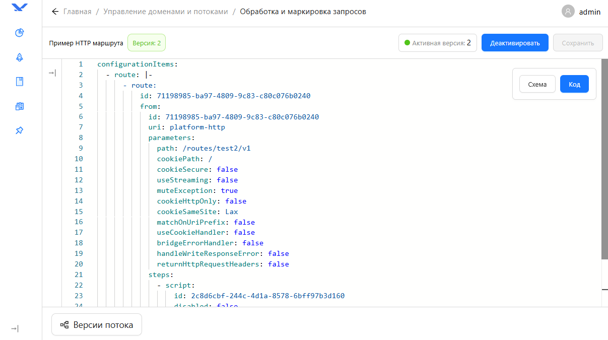 Если вам необходимо просмотреть поток непосредственно в коде для детального ознакомления с заполняемыми параметрами и особенностями структуры, вы можете переключиться в режим кода, нажав Код в правом верхнем углу рабочей области редактора потоков. Кнопки переключения между режимами отображения доступны при скрытой панели свойств блока.