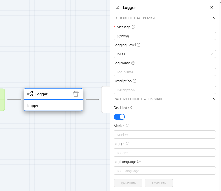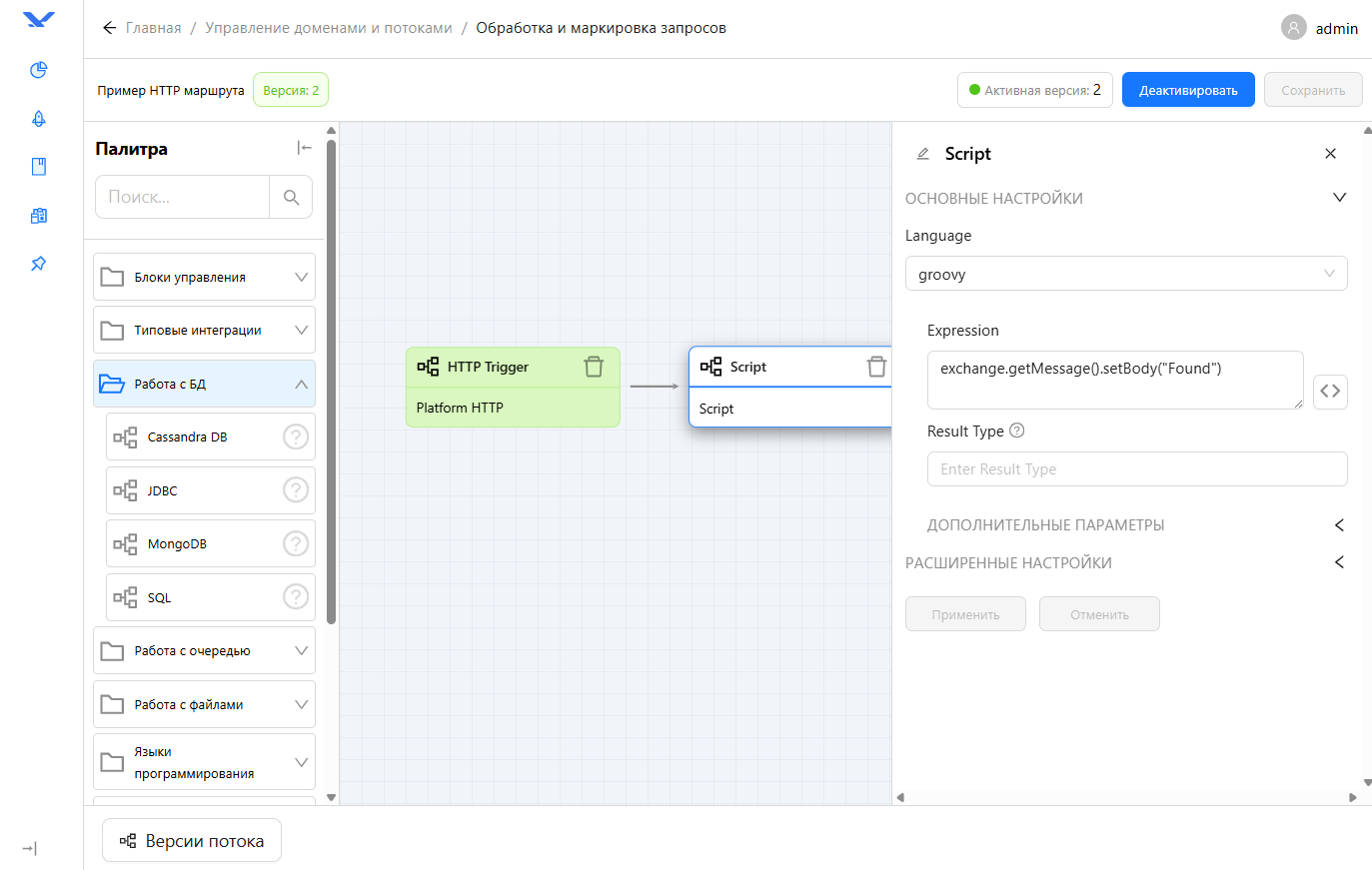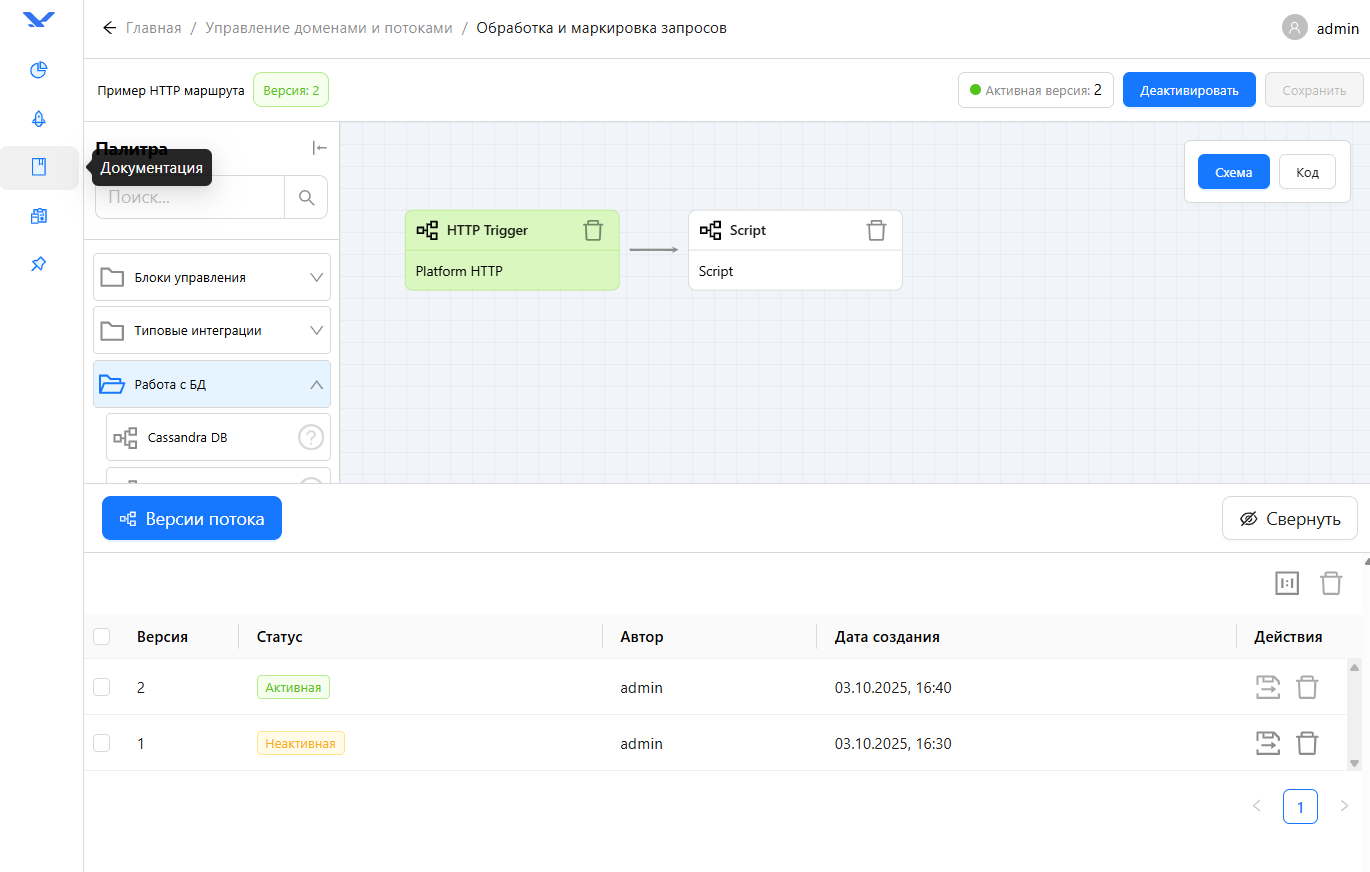 Рабочая область потока – основная часть экрана, на которой выстраиваются и конфигурируются последовательно или параллельно блоки и связки между ними. Вы можете переключаться между отображением потока в рабочей области в режиме схемы и в режиме кода.
