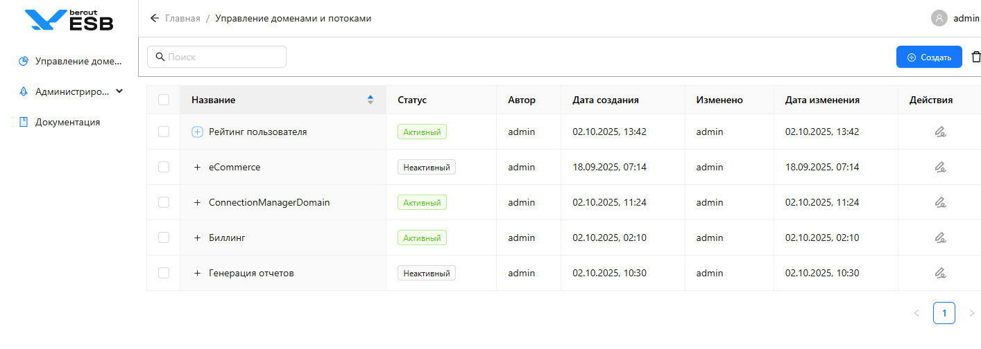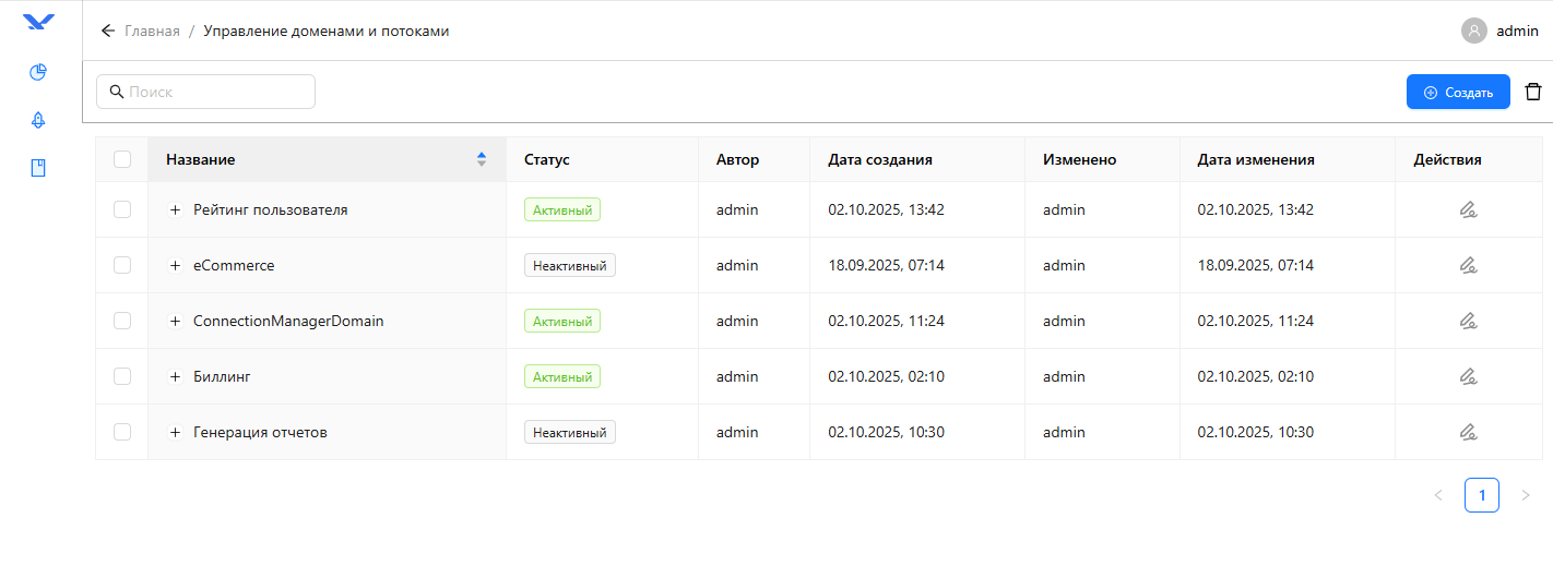 Управление доменами и потоками – раздел, где вы можете создавать и удалять домены и потоки, активировать потоки.